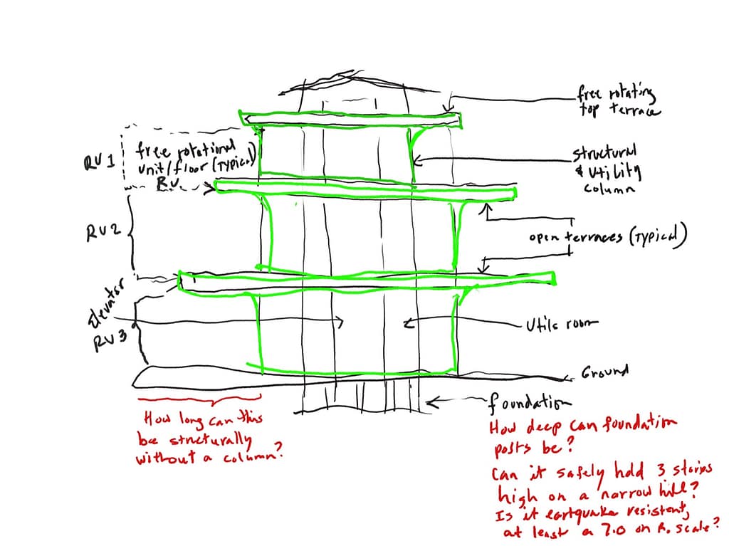 It looks like you have a conceptual building design that uses a central structural and utility column, around which each floor can rotate independently, similar to a lazy Susan. This is a fascinating and innovative architectural idea. Let’s address your questions and then discuss additional advantages and potential disadvantages.